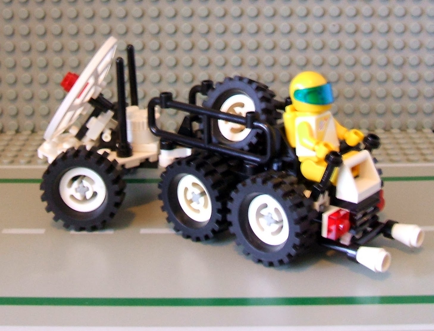 As a transport rig Lunar Transporter Patroller has a few elements in its favor. The battery box unit can come off and tip up, becoming a radar tower way-point. (It is back heavy without the battery, and will fall if unweighted.) Additionally, when paired with the cargo from 6990 the trailer can become a third cargo transporter for the Futuron fleet; thus living up to its name. Of course, the audience for this set was probably composed of parents who couldn't get 6990, and opted for something else with light and sound elements, so there is that limitation on further playability. That aside; there're plenty of crates in the Space theme that need carrying; or in a pinch we build one ourselves.