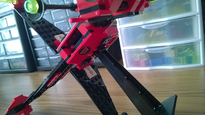 So, before I show it off I wanna brag on my solution... see, the cockpit swivels as a solid body front and back unobstructed by the arm leading into the main craft... and for a while I was trying to use the Particle Ionizer cockpit for my design, but with the efforts to get the rotating body, and the limited attachment points for the window I was looking at the bottom of the cockpit falling off with each rotation. And the window was too long, which meant the body either had to be bigger than reasonable relative to the wing assembly, or featherlight, with only a few pieces to it. After about an hour I changed the window choice for the prefab half octagon piece from Vector Detector. It's a bit too open by Star Wars standards... but for Legoland Space, I think it's perfect.